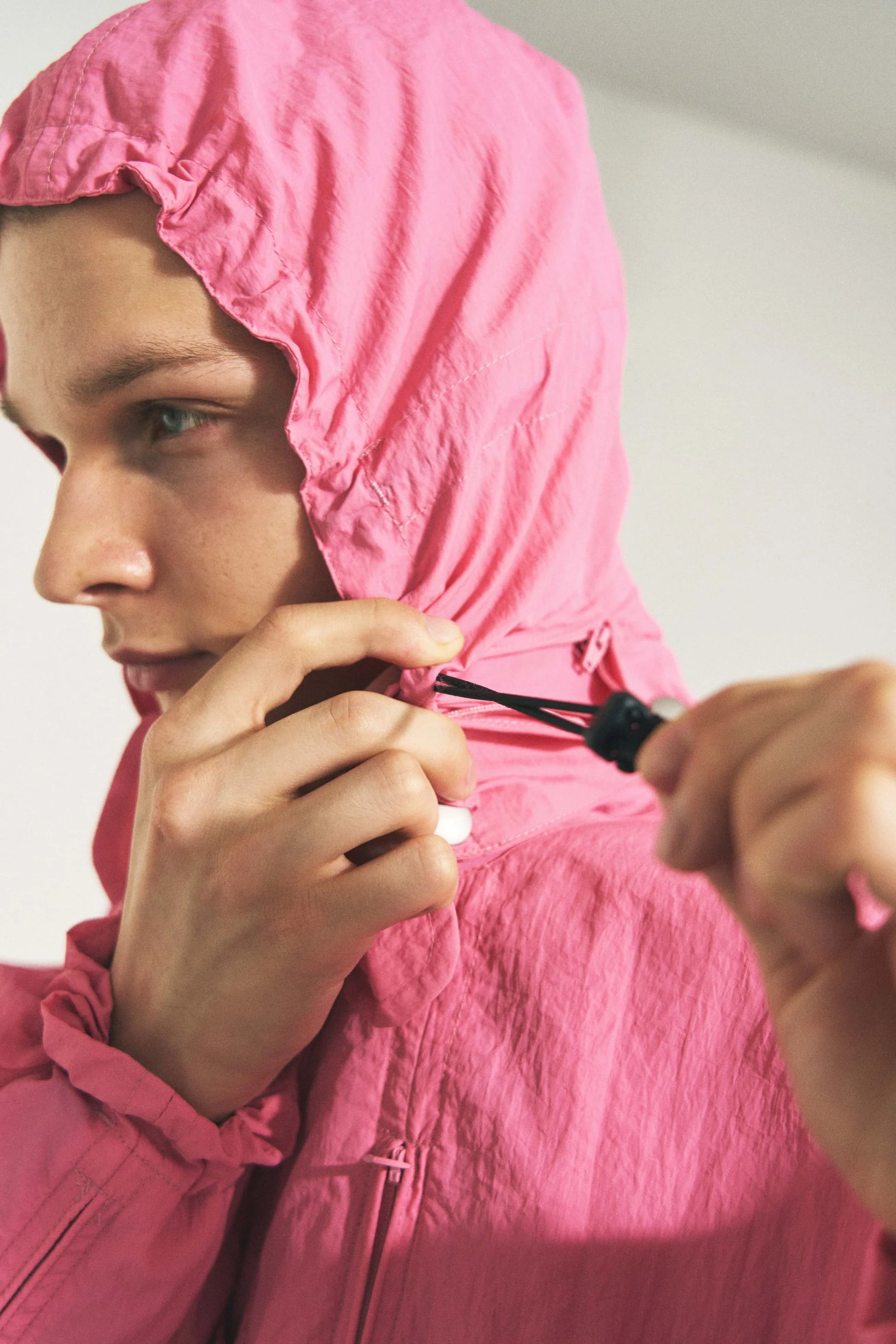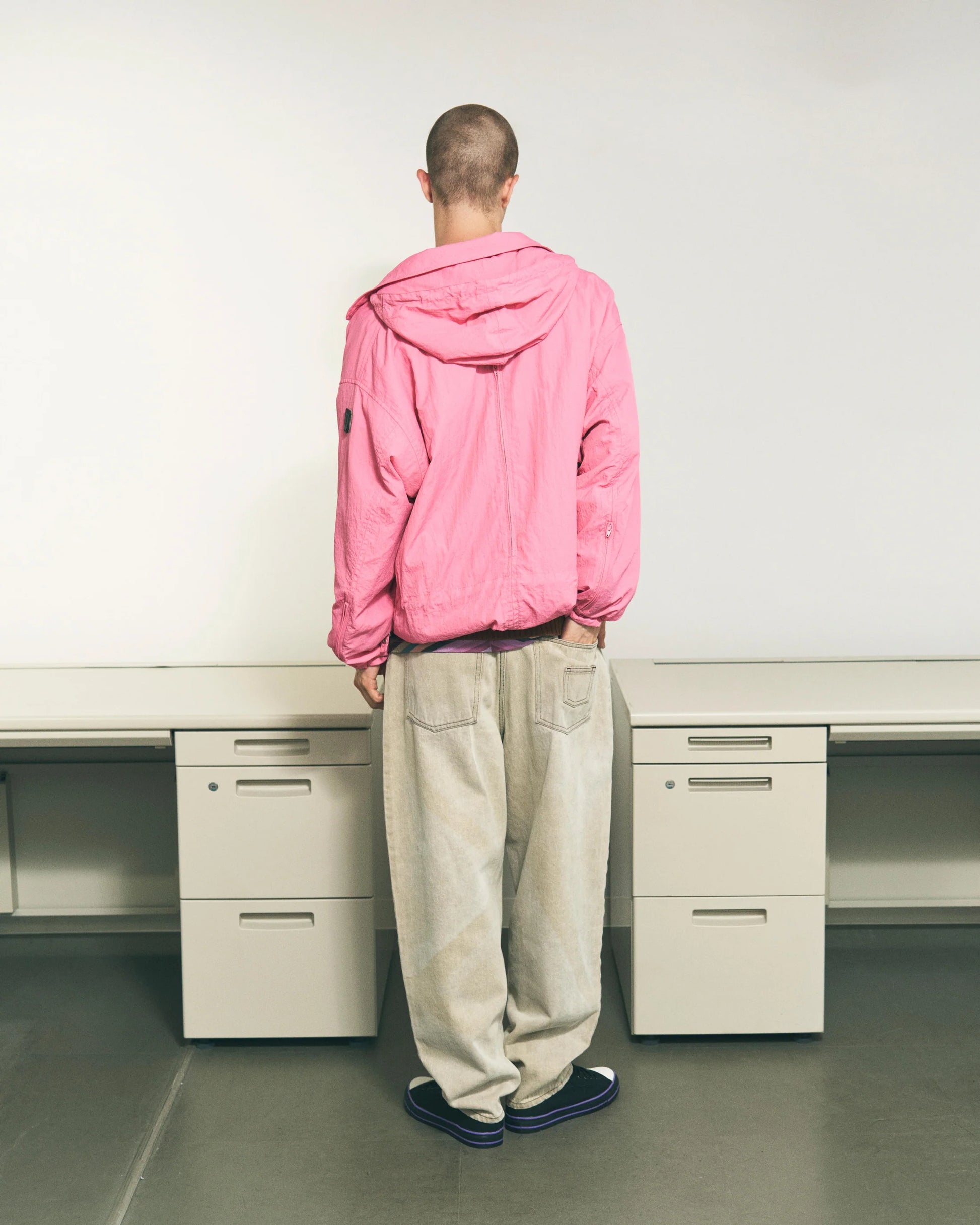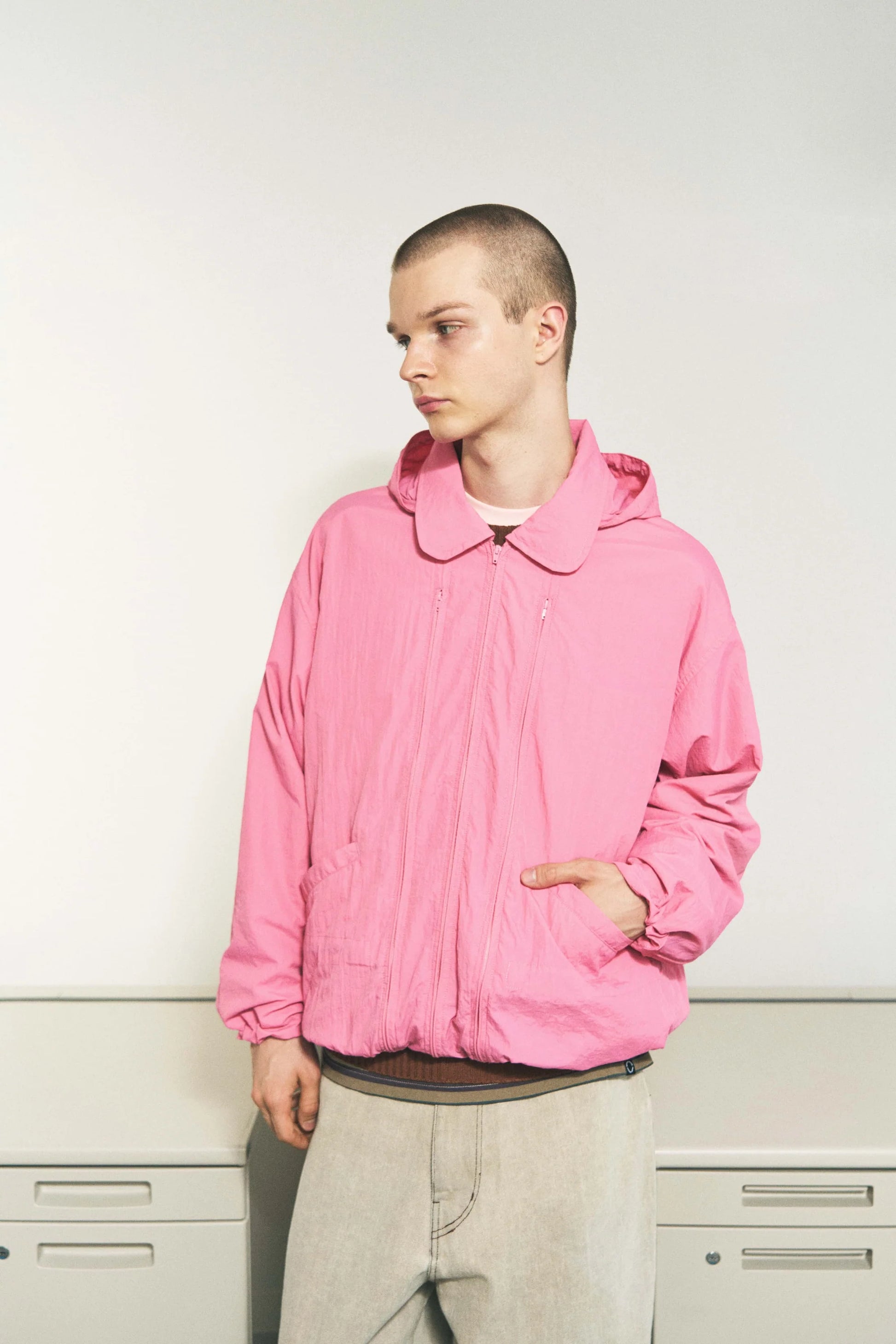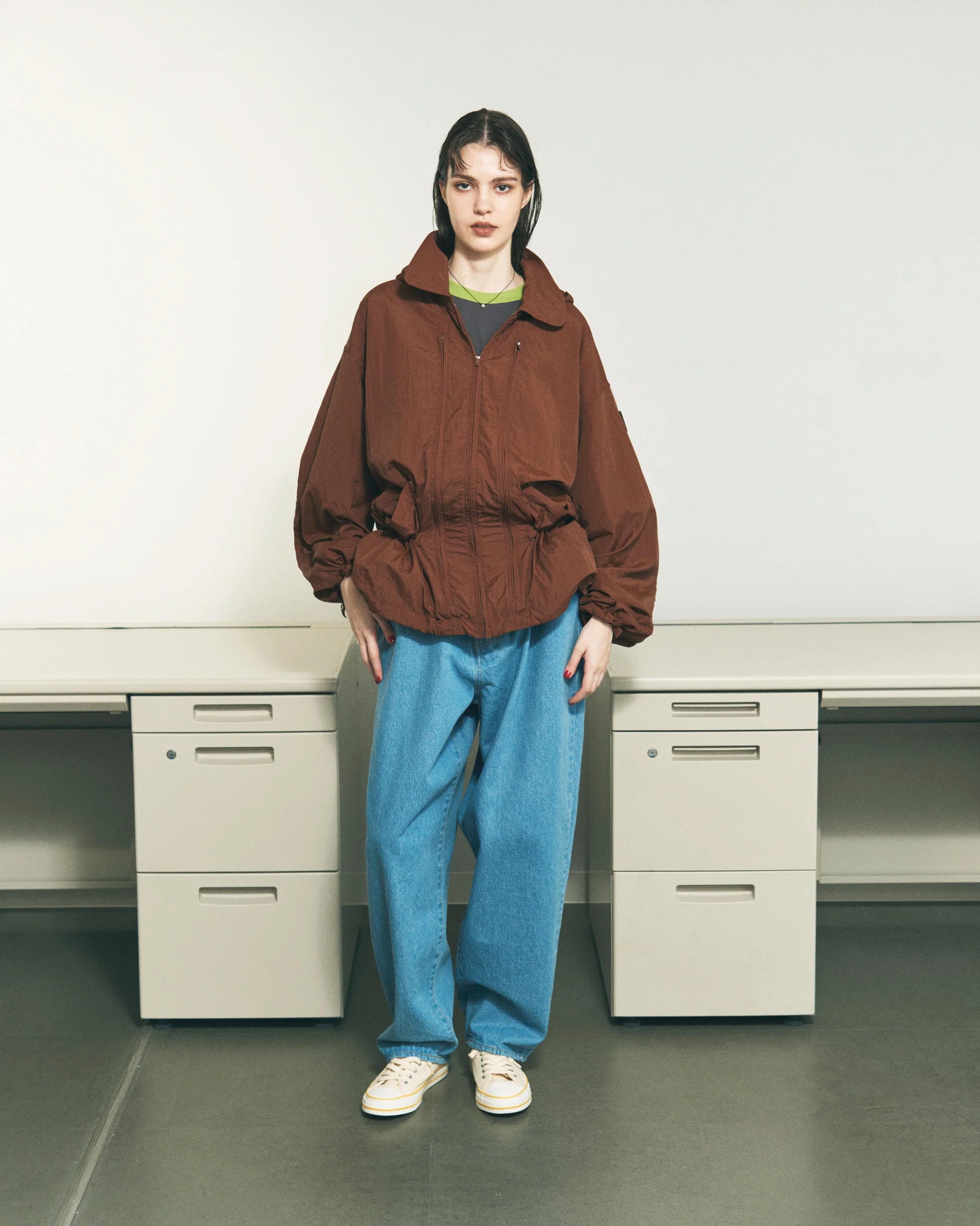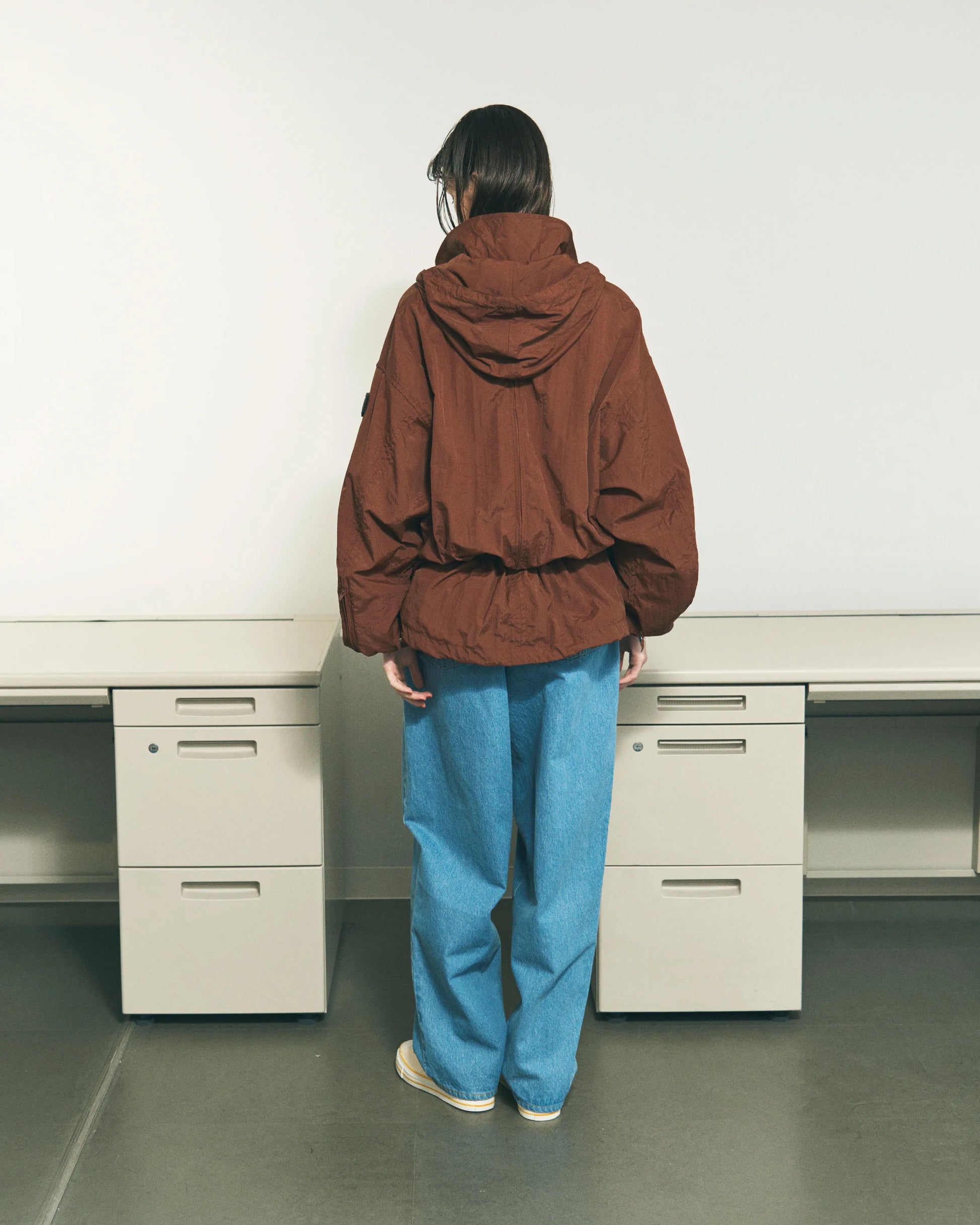 オーガニックなタッチのナイロンから成る一見ミニマルなブルゾンですが、生地は2枚重ねられ、ポケット収納、ドローストリングなどジャケットに必要な全ての機能が裏地と表地の間に内側に設置されたシークレットユーティリティブルゾンです。
