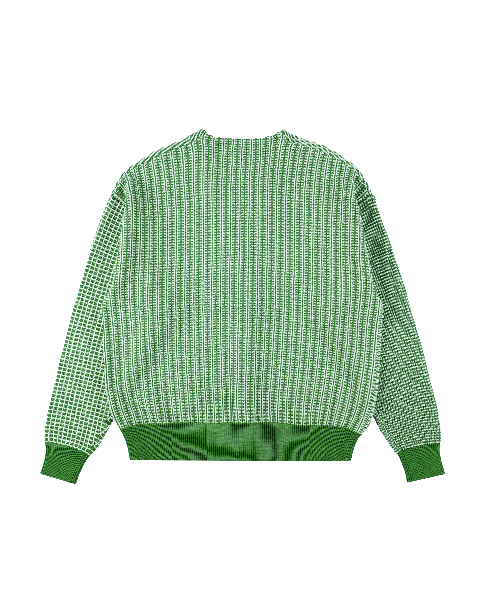 エンドはソリッドカラーでしめたスタイリッシュな仕上がり凝ったディテーリングを無理なく取り入れられるデザインニットです。
