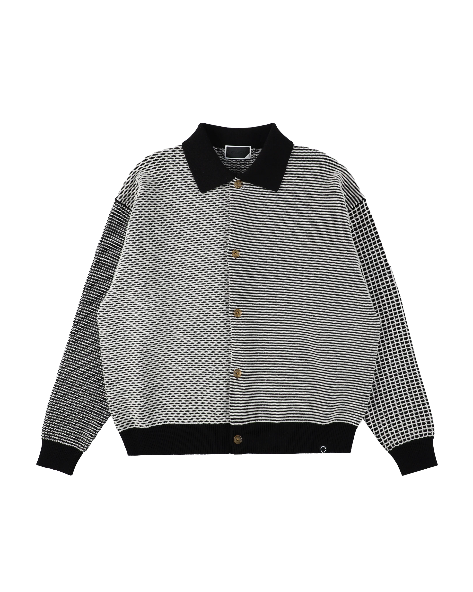 同糸で網目の違うニット地をパネルごとで切り替えたニットシャツ、カジュアルにアルチザンな雰囲気を演出しています。