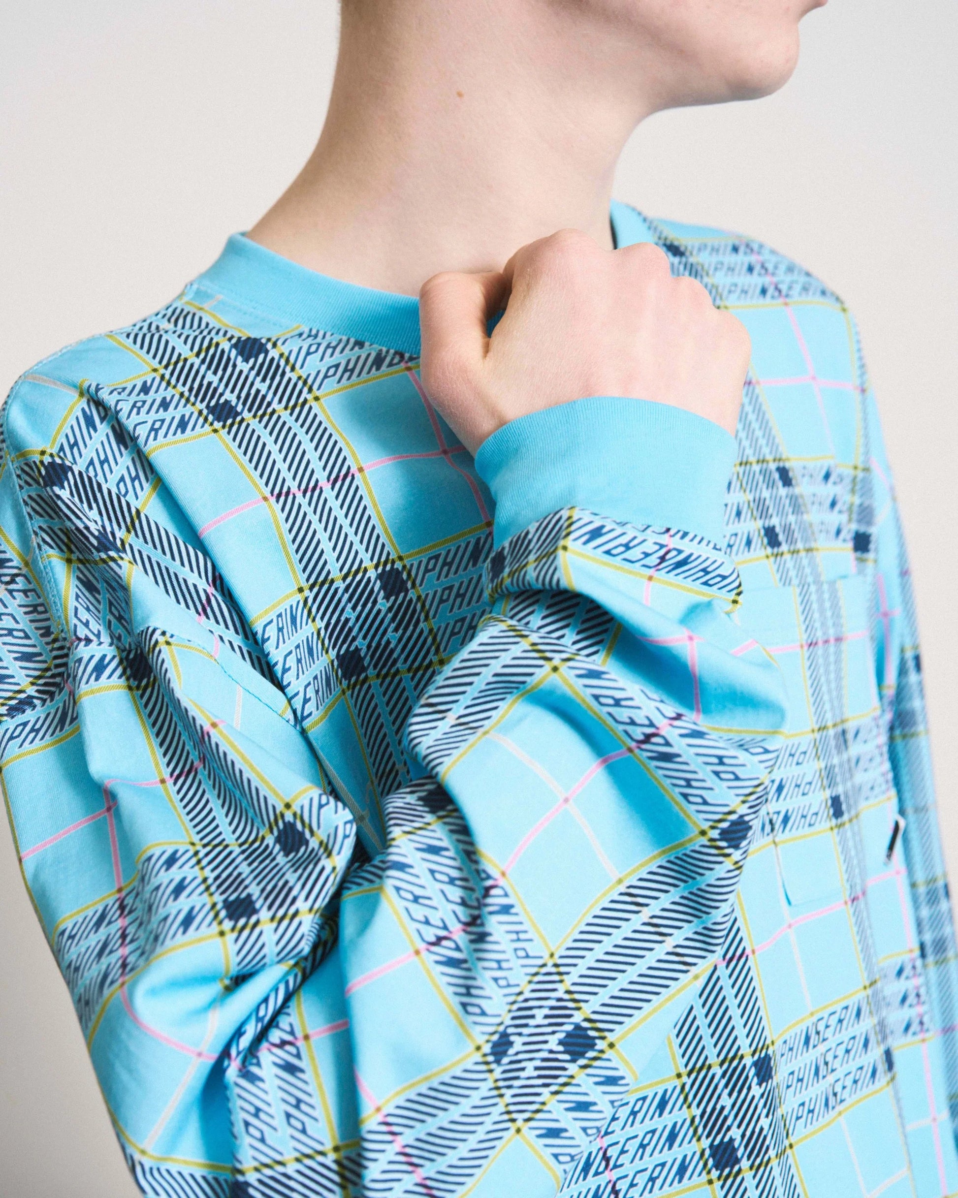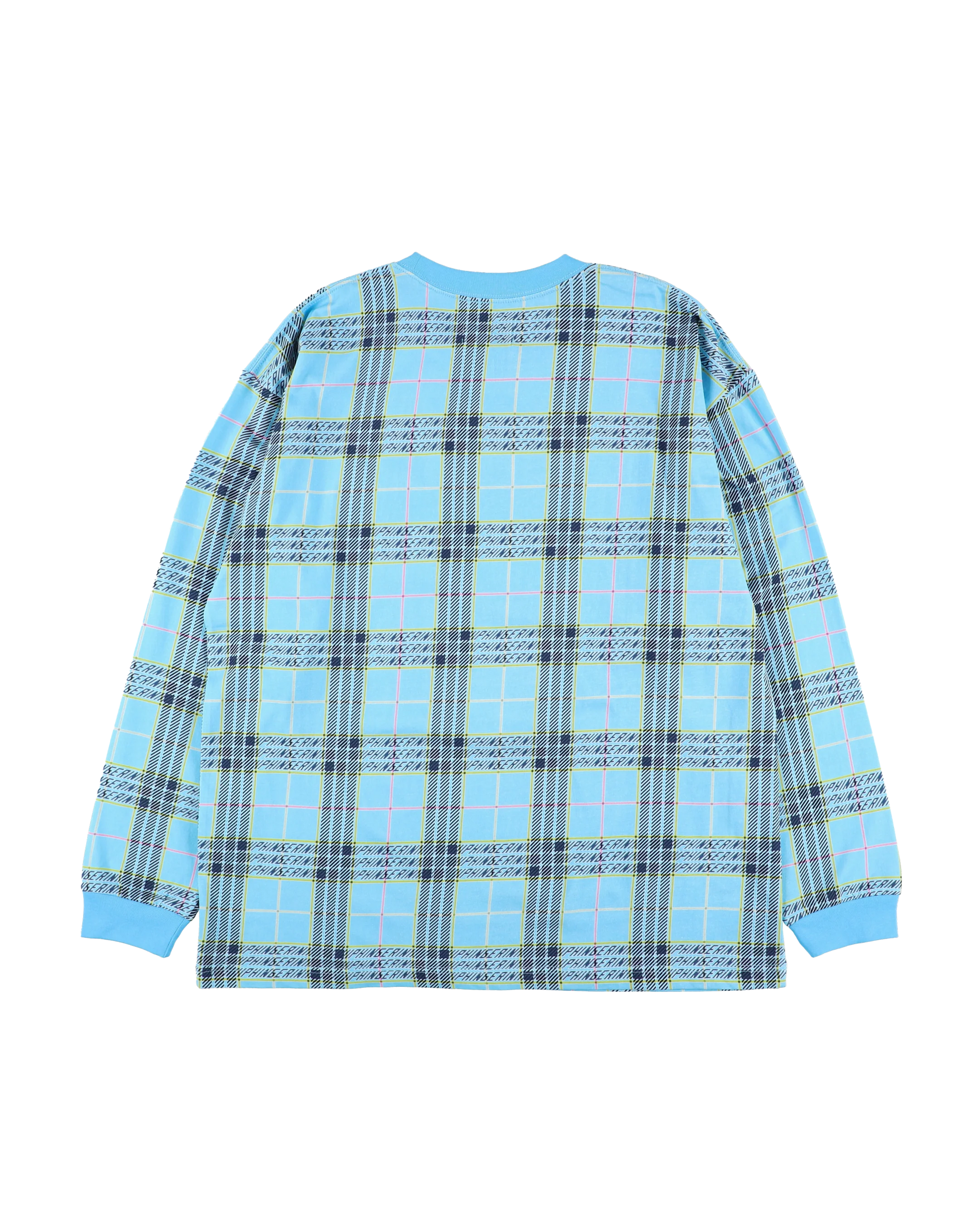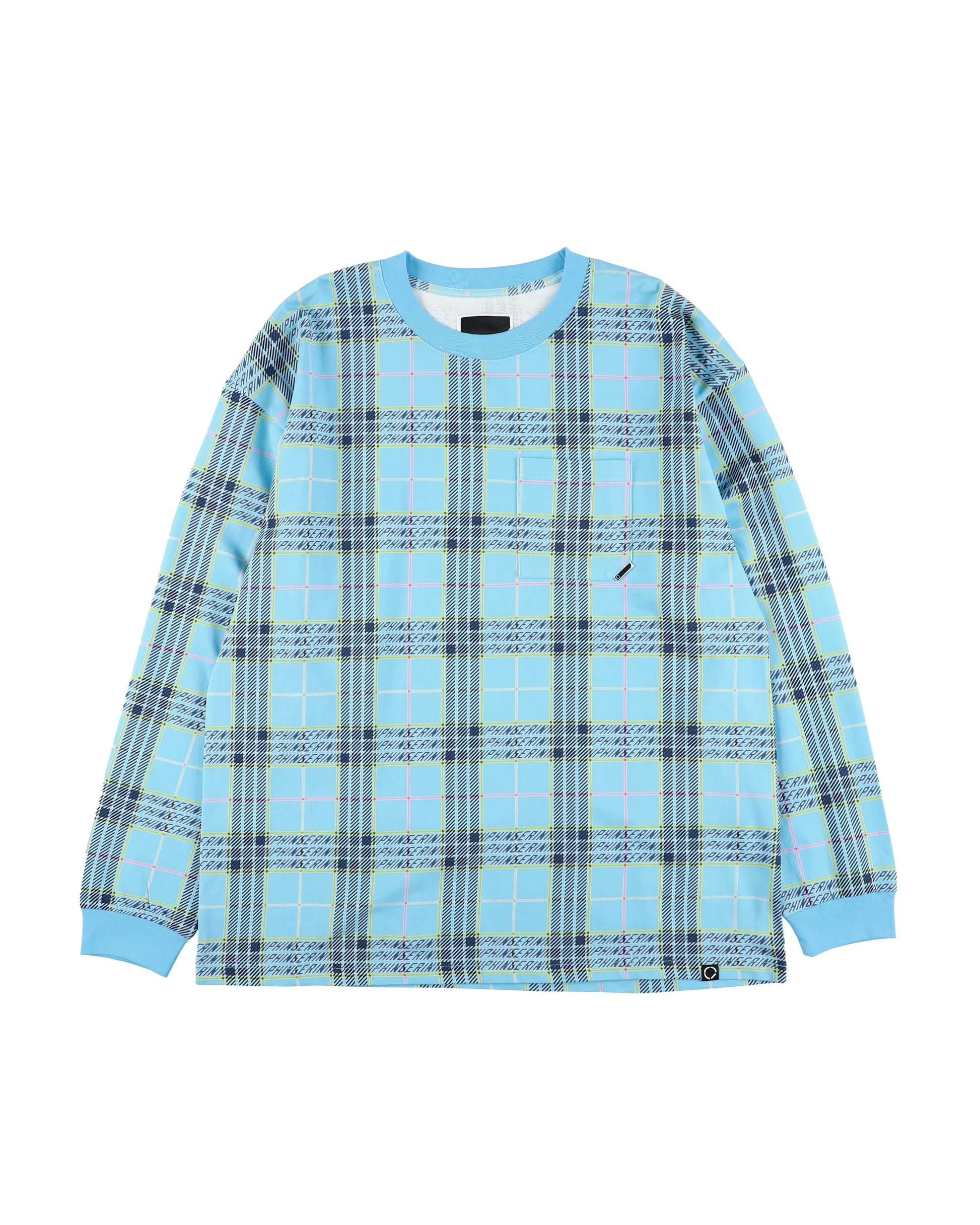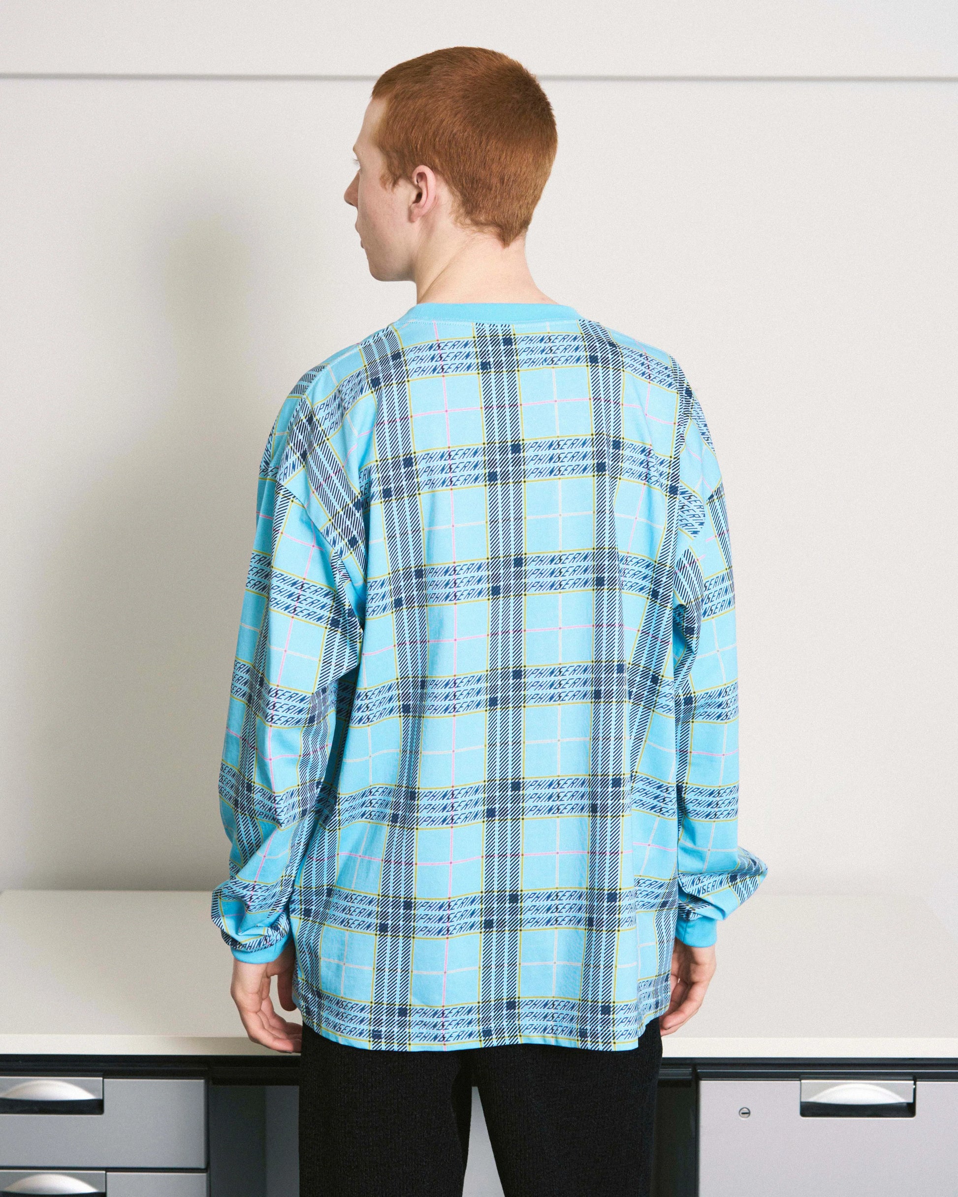 総柄オリジナルプラッドの天竺ロングスリーブTee 袖がポイントとなる重ね着や、通常チェックシャツを合わせるようなキレイな着こなしなどにもおすすめです。