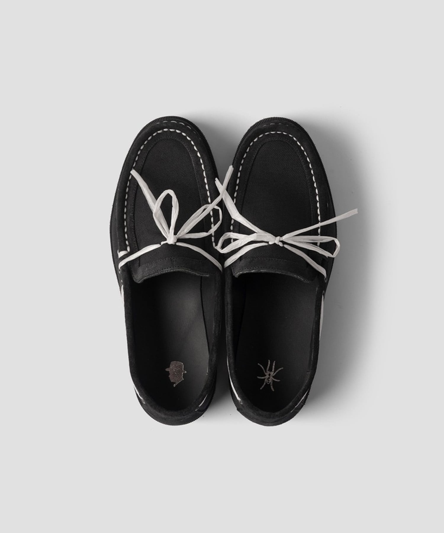 “Dyneema Moccasin” 一見するとビニール紐を使用している様に見えるが、ピアノ線の8倍の強度をもつダニーマの生地を 紐状にし、モカシンのモカ縫いに使用しました。